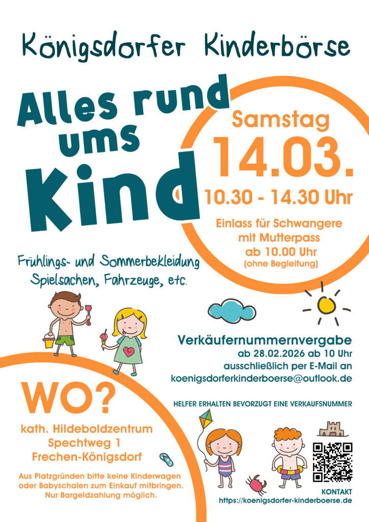Bei der Königsdorfer Kinderbörse könnt ihr Kleidung für Babys und Kinder, Spielzeug und alles, was man für Kinder so braucht (Kindersitze, Fahrräder, etc.) kaufen bzw. verkaufen. Wir veranstalten jedes Jahr zwei Börsen im Hildeboldzentrum in Frechen-Königsdorf – eine im Frühjahr für Sommersachen sowie eine im Herbst für Wintersachen. Vor Ort habt ihr gute Parkmöglichkeiten.